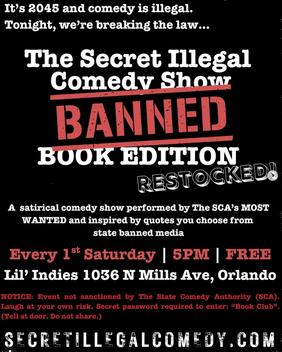 It’s a risk, sure. The SCA are always listening, but it’s a risk we’re willing to take for comedy. Come share a drink, read some contraband and have some illegal laughs with us!